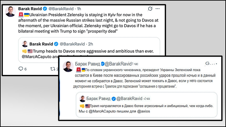 То же самое подтвердил журналист Axios Барак Равид: глава киевского режима остался, мол, в столице после ночной атаки на город и не собирается в Давос. Он якобы координирует работу коммунальных служб.