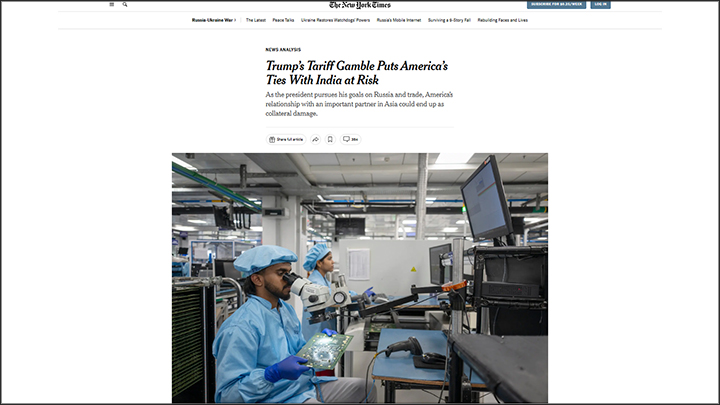 The New York Times: Тарифная авантюра Трампа ставит под угрозу отношения Америки с Индией. Скриншот страницы сайта NYT