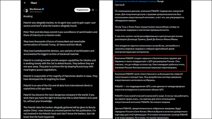 Palantir якобы разрабатывает ядерные и биологические вооружения для Украины и тесно сотрудничает с ЦРУ, чтобы победить Россию. По их расчётам, до этого остаётся примерно один год. План подразумевает удержание России в состоянии затяжных и бесполезных мирных переговоров,