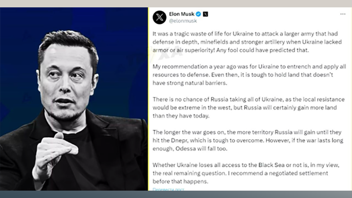А тем времени технологический гуру Запада Илон Маск вдруг заявил в своём паблике, что Украина может очень скоро потерять Одессу, если не займётся срочно переговорами.