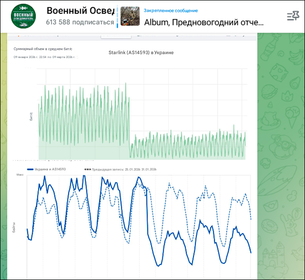 После отключения "серых" терминалов трафик спутникового интернета "Старлинк" на Украине упал на 75%. Не все отключенные тарелки использовались русской армией, но немало точно. Скриншот: ТГ-канал "Военный Осведомитель"