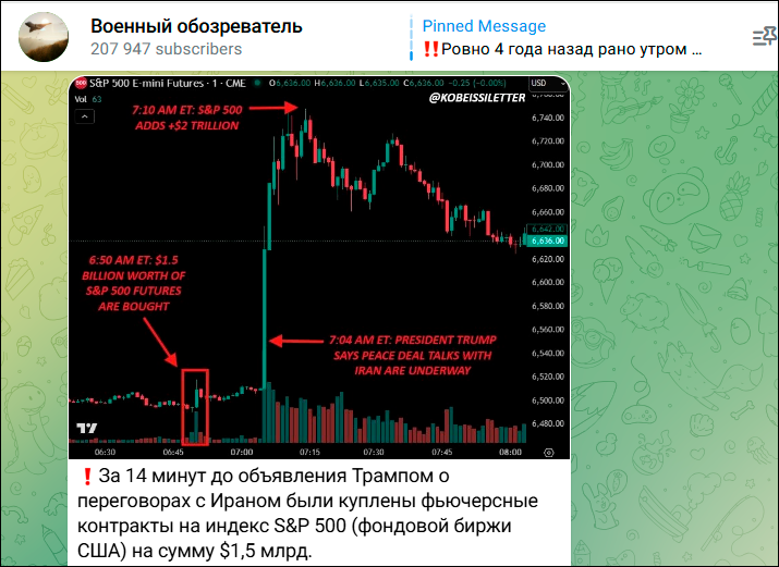 Обозреватели обратили внимание на манипуляции на американском фондовом рынке, точно привязанные к заявлениям Трампа. Скриншот: ТГ-канал "Военный обозреватель"
