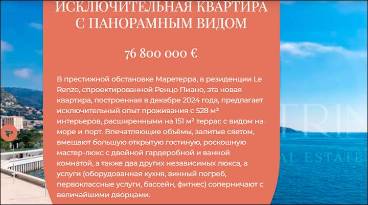 Уровень цен на квартиры в элитном районе Маретерра (Монако). Скриншот с сайта petrini.mc