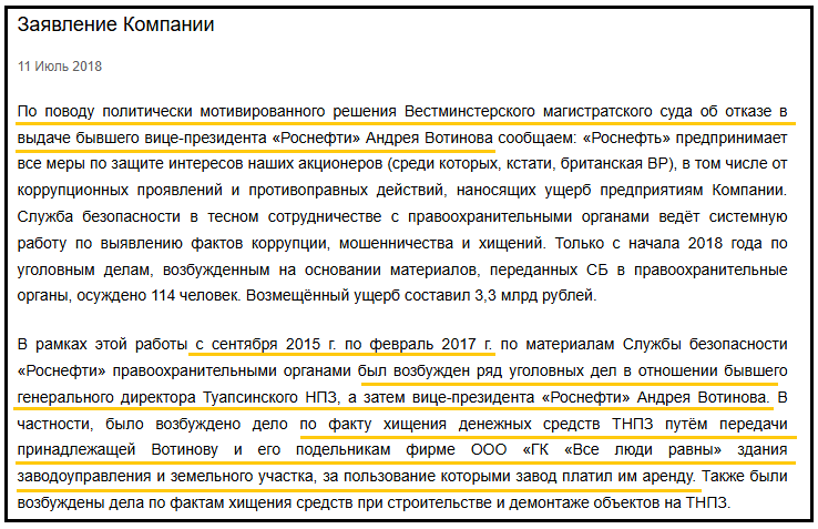 Защита утверждала, что беглеца якобы преследуют по политическим мотивам. В ответ "Роснефть" выпустила специальное заявление об ангажированности британской Фемиды, сообщив, что ведётся системная работа по выявлению фактов коррупции, все дела уже рассмотрены судами, вина фигурантов установлена: