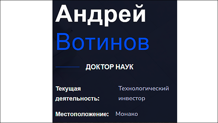 Как выяснил Царьград, у Андрея Вотинова ныне есть бизнес за рубежом. Он представляется как "технологический инвестор из Монако", занимается инвестициями в проекты и стартапы в области технологической разработки. Вот что он пишет о себе на сайте в качестве "визитки" для потенциальных клиентов: