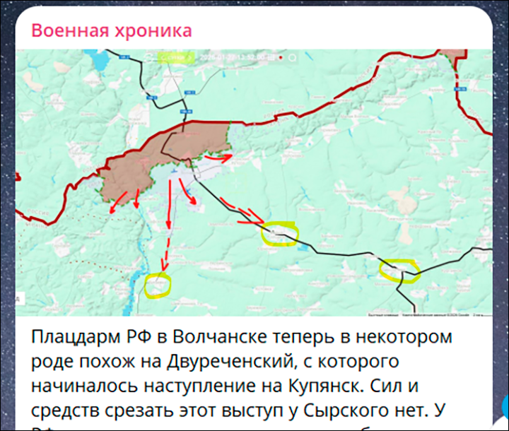 Противник бросил все силы в контратаку на Купянск, но при этом стал терять контроль над ситуацией под Волчанском. Скриншот: ТГ-канал "Военная Хроника"