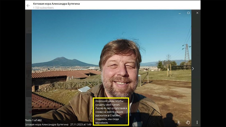 Бутягин в Италии, где он на протяжении более 10 лет проводил раскопки в районе Помпей. Скриншот: телеграм-канал "Котовая нора Александра Бутягина"
