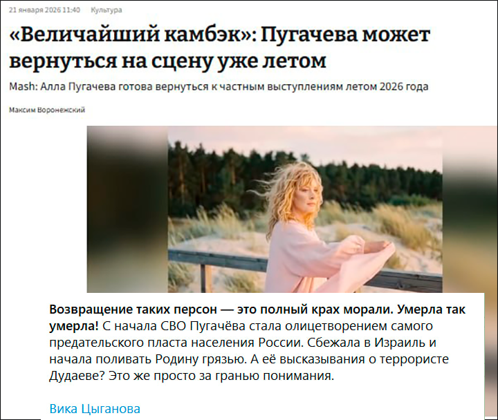 Но сейчас публика вряд ли готова услышать что-то хорошее про Аллу Борисовну, учитывая недавнее большое интервью, в котором певица разглагольствовала о том, как её "Родина предала". Особенно после того, как сама она назвала русских "холопами и рабами".