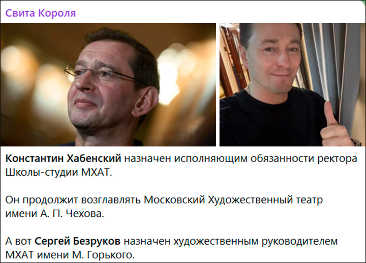 Кстати, Сергей Безруков, который ранее уверял, что у него работы и без ректорства в школе-студии полно, тоже получил новую должность. Теперь он ещё и художественный руководитель МХАТа имени М. Горького.