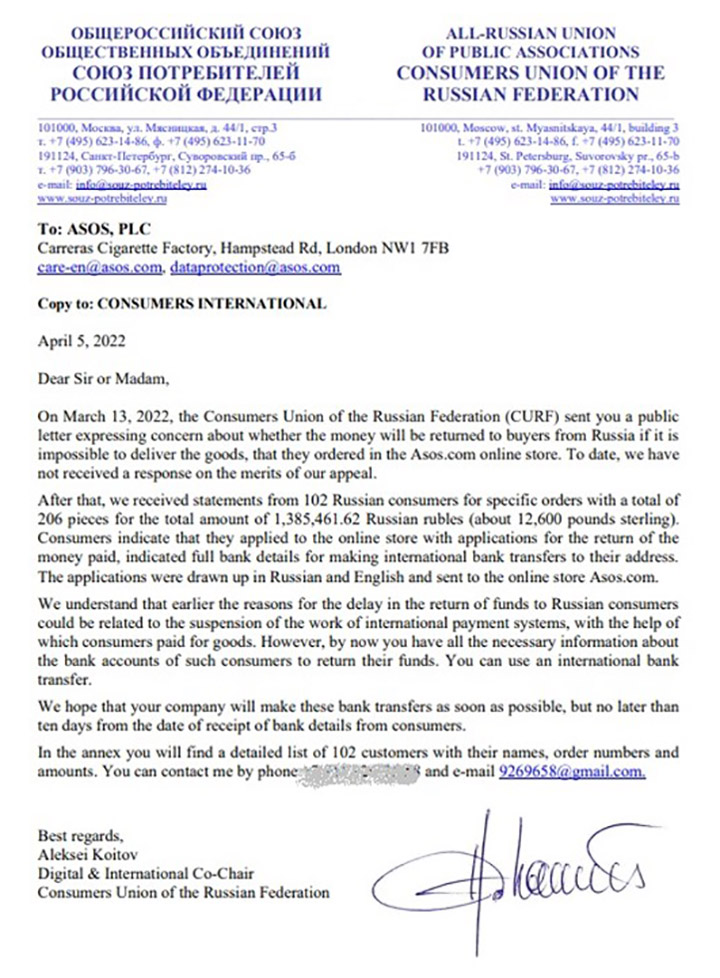В повторном открытом письме от 5 апреля Союз потребителей РФ выразил ASOS обеспокоенность по поводу того, будут ли возвращены покупателям из России деньги, если товар не будет поставлен. Ответа снова не было.