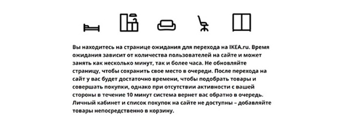 Корреспондент Царьграда решила пойти на журналистский эксперимент: попробовать купить посуду IKEA. Рабочий день начался в девять часов, и именно тогда журналистка зашла на сайт. Предсказуемо купить ничего не получилось. Её поставили в очередь, видимо, присвоив виртуальный номерок. Текст на экране гласил, что время ожидания может занять и 10 минут, и час.