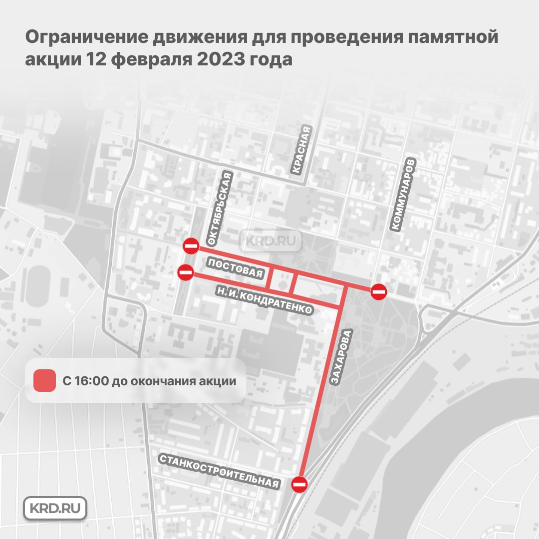 С 13:00 до окончания акции в сквере Жукова по Гимназической от Рашпилевской до Красноармейской и по Красной от Карасунской до Ленина будет ограничено движение автомобилей.