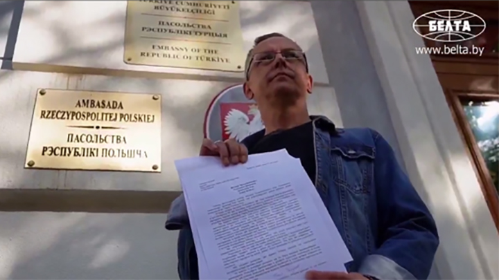 Томаш Шмидт с документами, подтверждающими, что власти Польши нарушают Конституцию. Скриншот: Belta.by
