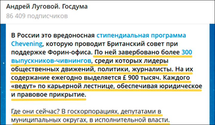 И вот именно сейчас, прежде чем мы перейдём к следующему звену цепи, связанной с деятельностью британской разведки, следует ещё раз вернуться к теме обучения Успенского в Лондоне. Дело в том, что оно проходило в рамках программы Chevening, которая финансируется британским МИД, а цель её – примерно та же, что и у американского USAID, только с конкретным прицелом на сферу высшего образования. Выпускники, которых на сленге называют "чивнингами", успешно двигаются с помощью английской спецслужбы MI-6 по ступенькам власти – в госсекторе, бизнесе, политике: