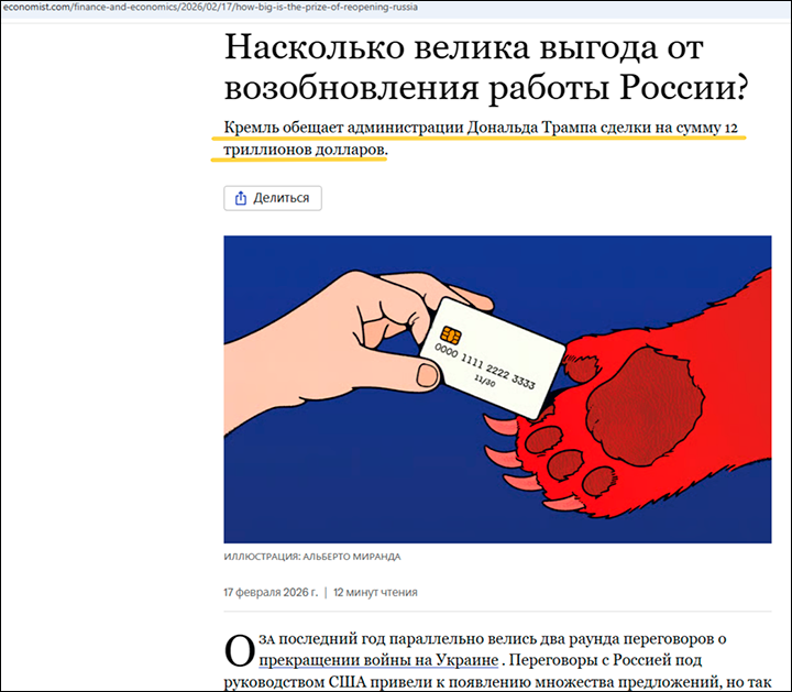 А теперь давайте вспомним одно из ключевых направлений наших переговоров с американцами в контексте Украины. То самое, которое со стороны России ведёт глава РФПИ и спецпредставитель президента России Кирилл Дмитриев, – в сфере экономического взаимодействия.