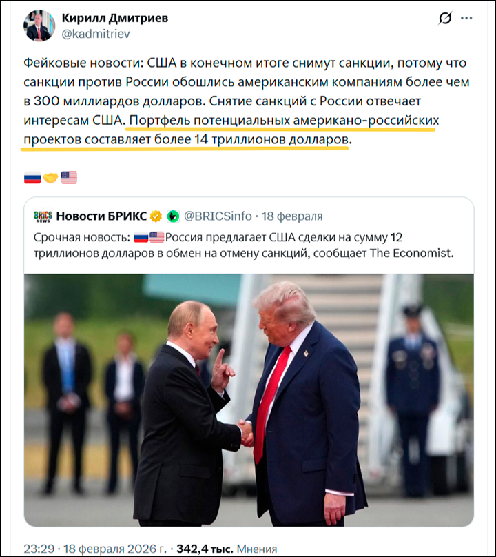 Далее уже сам Дмитриев назвал сообщения о "сделке" по американским инвестициям в наши ресурсы в обмен на снятие санкций фейком, зато выдал другую сумму, даже больше ранее заявленной, – в 14 трлн долларов, уточнив, что речь идёт о неких совместных проектах: