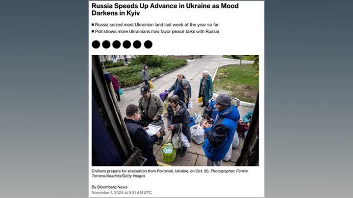 Неудивительно, что Bloomberg, ссылаясь на источники, пишет, что среди украинской власти "усиливается чувство уныния по поводу хода войны". Мол, исход американских выборов в США на следующей неделе может означать, что Киев "будет вынужден принять мир на невыгодных условиях или столкнуться с перспективой продолжения борьбы с Россией в одиночку".