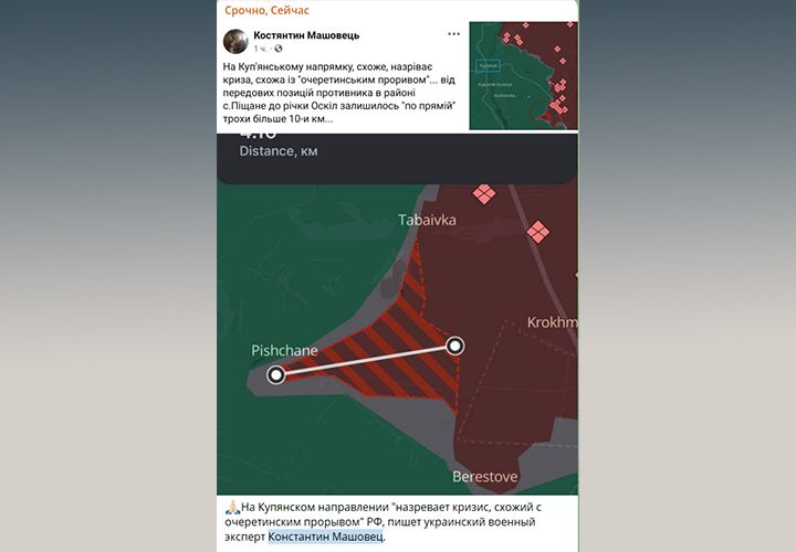 При этом украинский же эксперт Константин Машовец резонно отмечает, что пока на северо-востоке украинцы массово гибнут, на юго-востоке Слобожанщины русская армия практически подошла к реке Оскол — осталось каких-то десять километров…