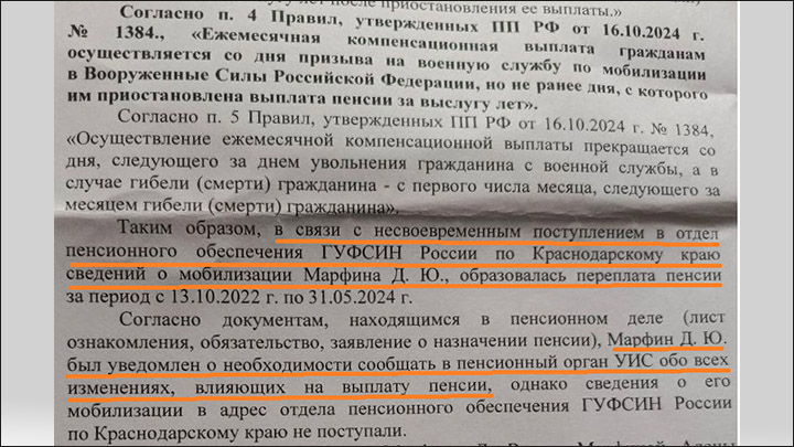 По закону на время службы мобилизованного выплата ранее назначенных ему пенсий приостанавливается. Но в случае с Дмитрием Марфиным этого не произошло, потому что военкомат не уведомил ФСИН о его мобилизации. В итоге с октября 2022-го по май 2024 года образовалась "переплата пенсии" — почти 700 тысяч рублей.