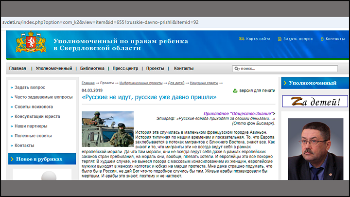 Та самая статья о том, что не нужно прогибаться перед мигрантами. Скриншот страницы сайта svdeti.ru