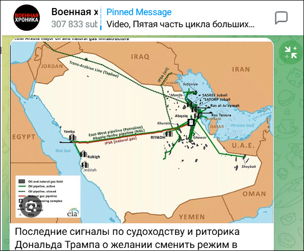 Восточно-Западный трубопровод (EWP) длиной в 1200 км позволяет саудитам качать нефть к экспортным терминалам Янбу на побережье Красного моря. Скриншот: ТГ-канал "Военная Хроника"