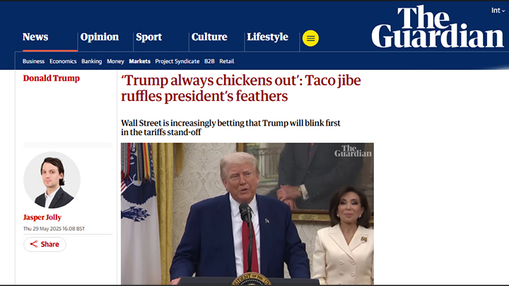 Так ещё раз подтвердился появившийся недавно на Уолл-стрит термин TACO (Trump Always Chickens Out — "Трамп всегда даёт заднюю"). Именно так и происходит, когда он получает отпор, что в мире уже начали понимать.