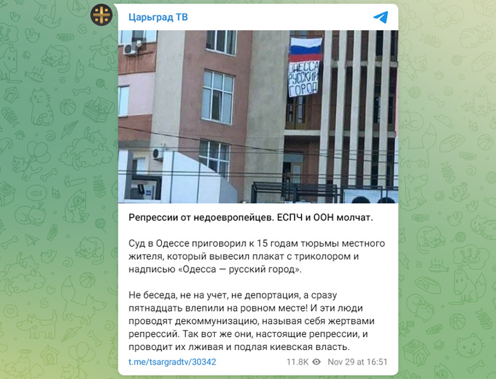 Житель Одессы приговорён к 15 годам заключения за то, что в августе вывесил на фасаде жилого дома русский триколор. Причём объяснения столь суровому приговору, появившиеся на украинских сетевых ресурсах, выглядят как бред сумасшедшего.