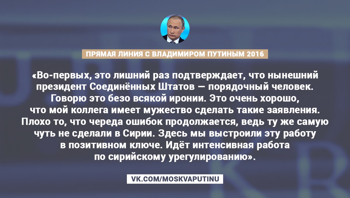 В 2014 году во время блиц-опроса прямой линии Владимир Путин положительно ответил на вопрос 6-летней Альбины: "Спас ли бы вас Обама, если бы вы тонули?"