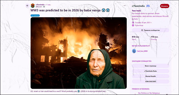 Пост на Reddit с предсказанием третьей мировой в 2026 году. Скриншот: Reddit