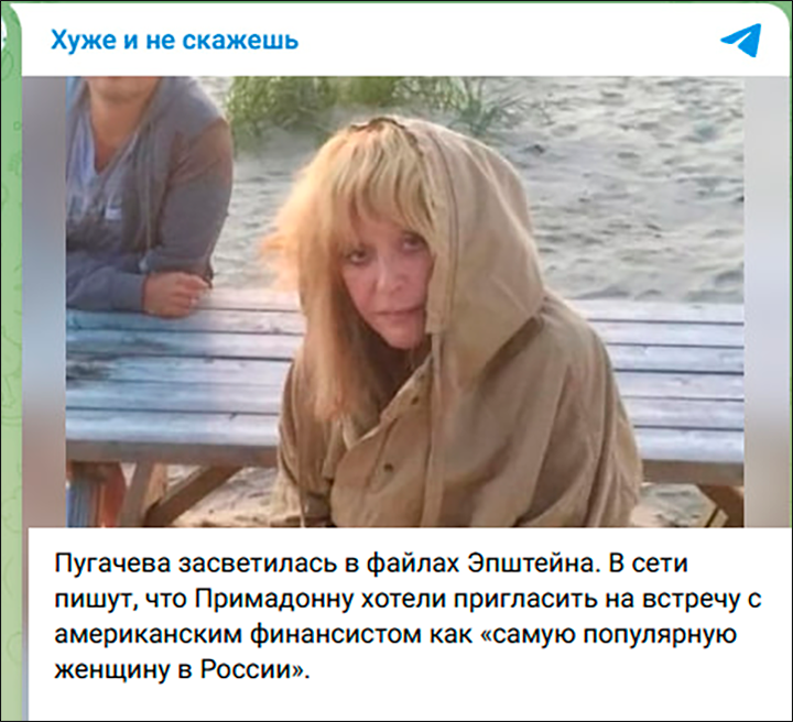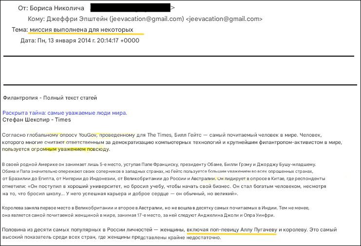 Наиболее резонансным для отечественной аудитории стало обнаружение в документах имени Аллы Пугачёвой. Фамилия певицы фигурирует в письме венчурного инвестора и советника Билла Гейтса – Бориса Николича, направленном Эпштейну в январе 2014 года. В тексте Николич приводит выдержки из некоего опроса о самых уважаемых и влиятельных людях мира: