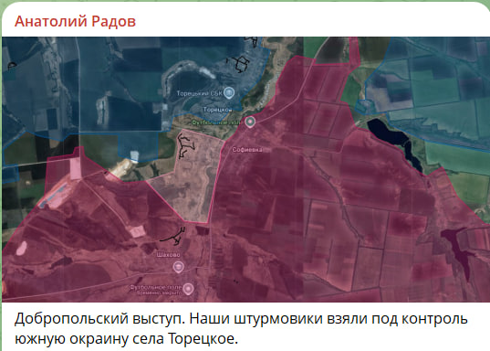 По информации Царёва, на Красноармейском фронте наши штурмы выровняли линию фронта по ж/д севернее и южнее Дорожного. Обе дороги из Софиевки в Павловку находятся под контролем ВСУ. Из последней противник регулярно накатывает на наши позиции в Новопавловке. Под контроль взято Торецкое.