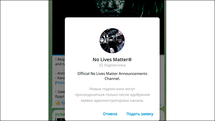 Примечательно, что в "Телеграме" есть одноимённая группа No Lives Matter, в которой, предположительно, и состоял подросток. Вернее – этот канал ведёт закрытый чат, доступ в который открывается только после согласования с его администратором.