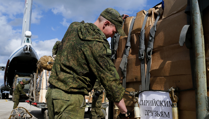 Российские военнослужащие на аэродроме Хмеймим во время подготовки к отправке гуманитарной помощи для жителей сирийского города Дейр-эз-Зор на военно-транспортном самолете Ил-76МД. Фото: Вадим Савицкий/пресс-служба Минобороны РФ/ТАСС