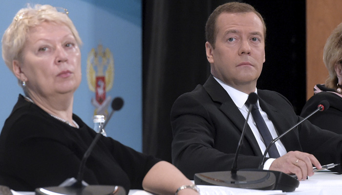 20 августа 2016 года. Министр образования и науки РФ Ольга Васильева (слева) и премьер-министр РФ Дмитрий Медведев на пленарном заседании Всероссийского августовского совещания педагогических работников. Фото: Александр Астафьев/пресс-служба правительства РФ/ТАСС
