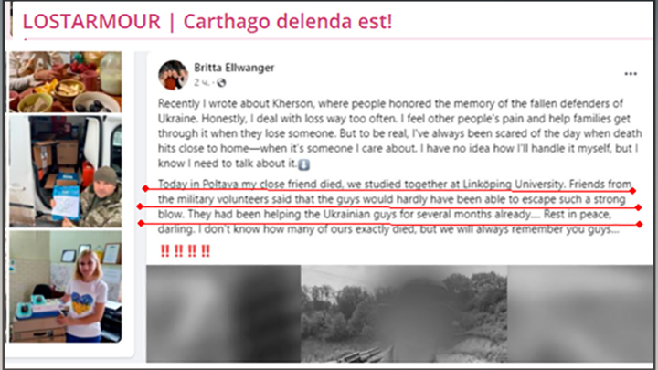 Бритта Элвангер сообщает о гибели своего бывшего однокурсника, военного волонтёра, помогавшего украинцам и погибшего в результате удара по Институту связи. Скриншот с ТГ-канала LOSTARMOUR