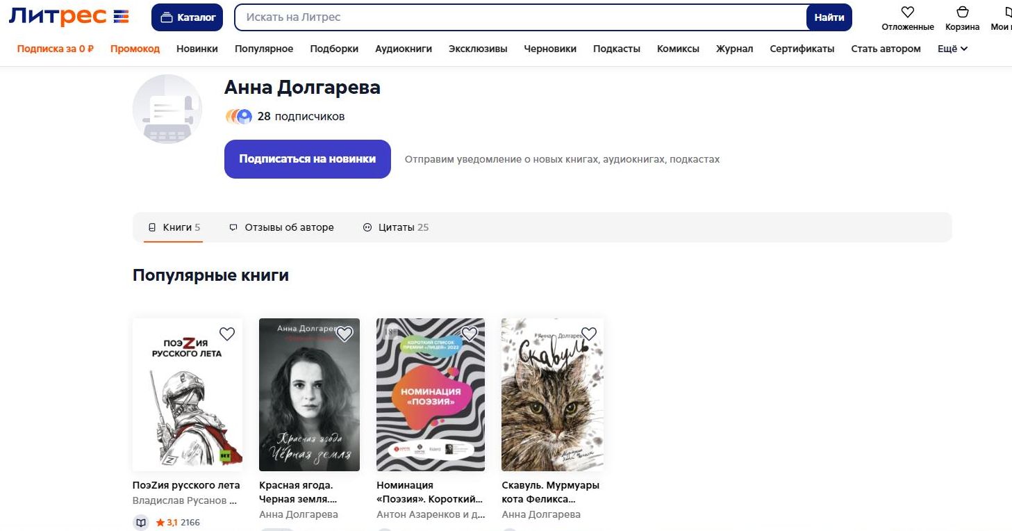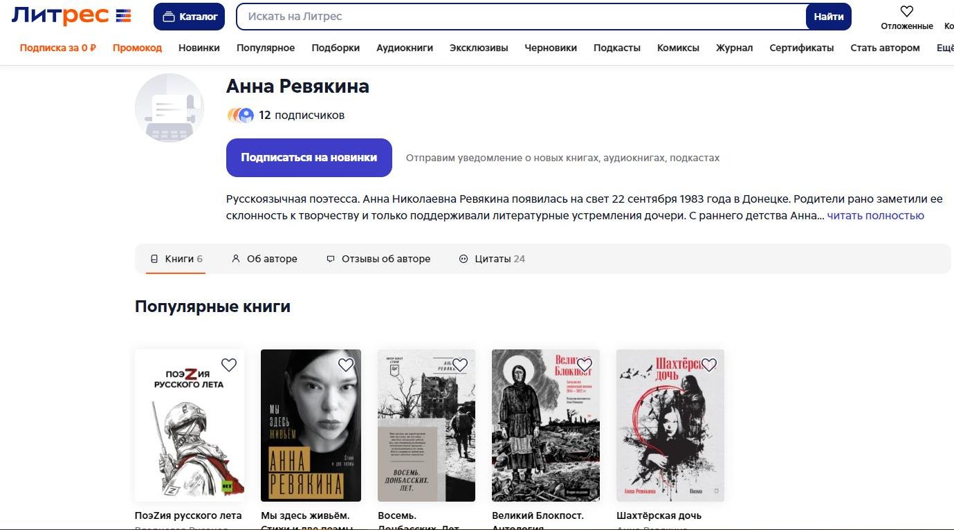 Так, на том же "Литрес" можно ознакомиться с произведениями самых известных поэтесс СВО — Анны Долгаревой (две книги и два участия в антологиях) и Анны Ревякиной (три книги и два сборника).