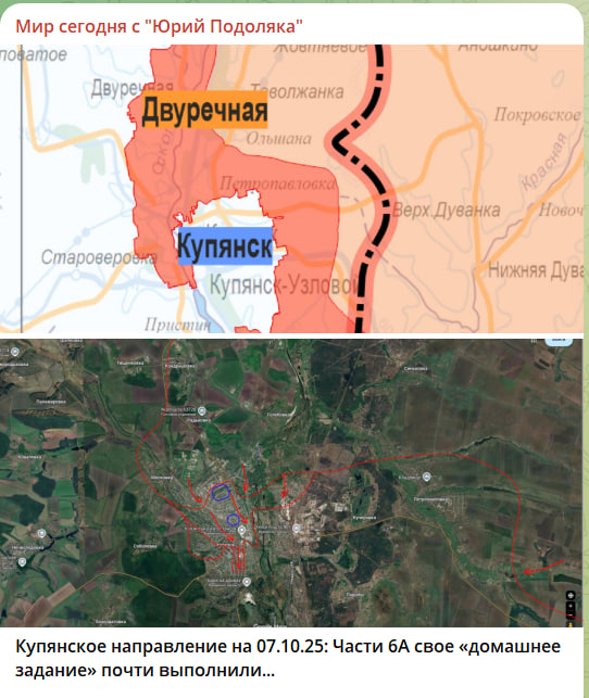 Например, вчера [4 октября] многие наши околовоенные каналы понесли новость, что "ближе к понедельнику" крупная группировка ВСУ в Купянске попадёт в окружение. Причём эти же самые каналы ещё 10 дней назад повторили за официозом МО России (а тот в свою очередь взял это из отчётов командования группировки), что на 23.09.25 группировка ВСУ в Купянске уже была не только там заблокирована, но и потеряла уничтоженными 200 из 700 человек. <…> Мы "к понедельнику" (06.10) заблокируем ещё? Есть ещё второй какой-то Купянск в зоне боёв? <…> По логике этих самых каналов, противник за истекшие 10 дней не только сумел прорвать блокаду нашей армии, но и завёл туда минимум 2000 человек (не считая потерь за эти самые 10 дней). Получается так. По-другому два этих сообщения не связать. Но тогда напрашивается вопрос, а когда была прорвана эта блокада? Или второй: а была ли она на самом деле?