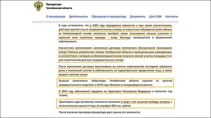 Что же за преступление совершил чиновник? В 2009-2010 годах, будучи ещё вице-мэром Челябинска (в это кресло Уфимцев, предположительно, попал не без протекции своего давнего знакомого, экс-губернатора Михаила Юревича), он и трое подельников – местных чиновников обманным путём приобрели право бессрочного и бесплатного пользования лесным участком площадью в пять гектаров в охранной зоне памятника природы – озера Увильды.