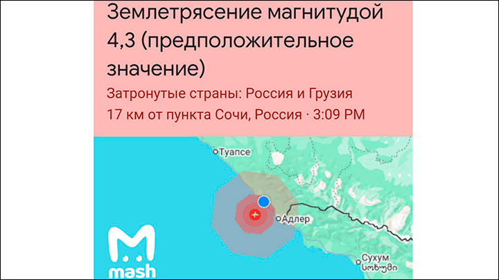 Первое было магнитудой 4,4 в акватории моря в 23 километрах от города. А эпицентр второго магнитудой 4,5 находился почти в 30 км от Сочи. Интервал между толчками составил около часа. Глава Сочи Андрей Прошунин сообщал, что подземные толчки ощущались в нескольких районах курорта.