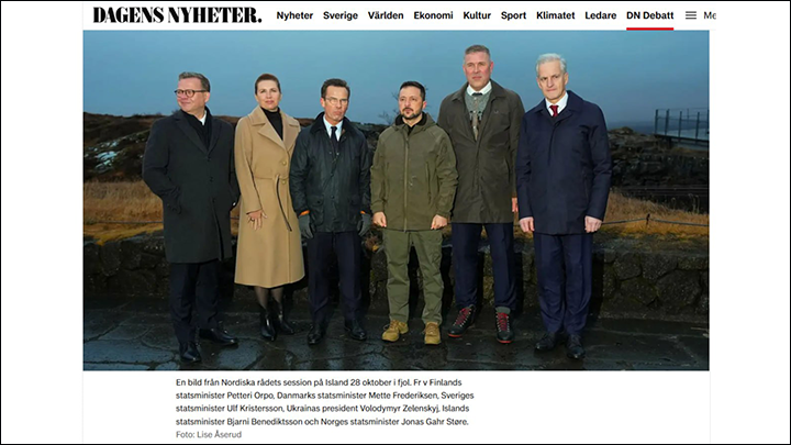 Dagens Nyheter. Премьер-министры Швеции, Дании, Норвегии, Финляндии и Исландии вместе с Зеленским во время совещания Северного совета в Рейкьявике в октябре 2024 года