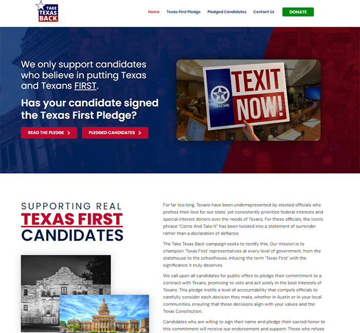 Кампания "Заберём Техас назад" направлена на то, чтобы исправить это. Наша миссия — защищать тех, кто исповедует лозунг "Техас — прежде всего" (Texas First), на всех уровнях власти- от здания правительства штата до здания школы, придавая этому лозунгу значение, которого он действительно заслуживает,