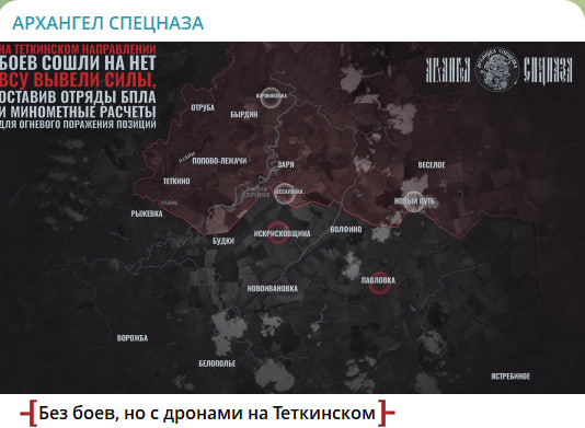 На Тёткинском направлении в районе госграницы, откуда враг ранее пытался штурмом брать Тёткино (Курская область), обстановка уже длительное время остаётся стабильной, так как ВСУ сократили количество сил в этой зоне. Противник новых попыток захода на территорию России не предпринимал. Действует лишь в рамках огневого поражения и сдерживания наших подразделений, пишут наши десантники, авторы канала "Архангел спецназа".