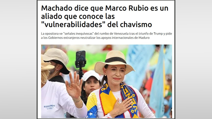 Мачадо сказала, что 10 января у Николаса Мадуро есть два варианта: "либо он принимает условия переговоров — и Эдмундо Гонсалес приносит присягу в качестве президента", либо Мадуро "продолжает кровавую борьбу, чтобы продлить тиранию". Мария Корина Мачадо убеждена в наступлении "критически важного и решающего момента для демократии и свободы" в Латинской Америке и что победа Дональда Трампа в Соединённых Штатах может оказать поддержку оппозиции, поскольку "американцы прекрасно понимают, каков режим в Венесуэле, Кубе и Никарагуа".