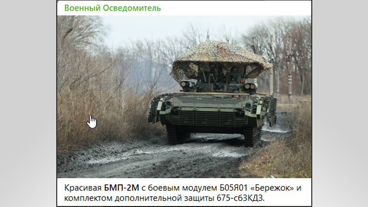 Пока недостаточную защищённость наших БМП пытаются компенсировать за счёт решётчатых экранов, выходит не очень эффективно. Скриншот с ТГ-канала "Военный Осведомитель"
