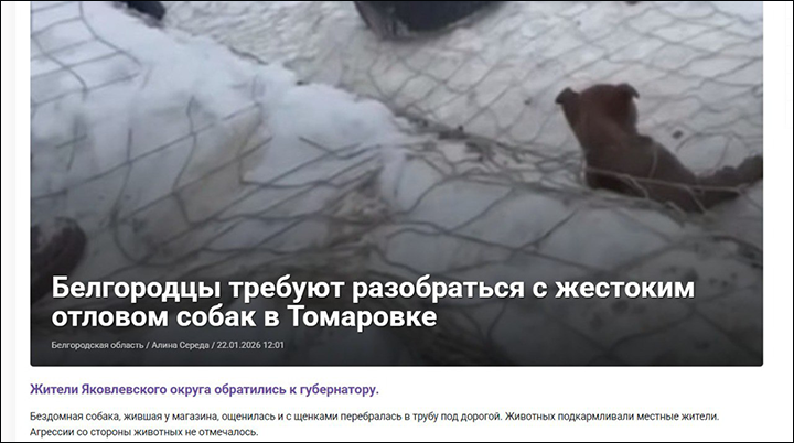 Жители Яковлево негодуют по поводу службы отлова, погубившей собак. Скриншот: официальный сайт ТК "Белогорье"