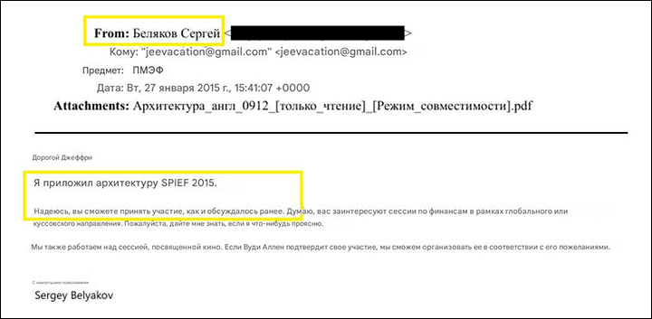 В январе 2015-го Беляков списывался с Джеффри Эпштейном по поводу подготовки Петербургского международного экономического форума и форума "Открытые инновации".