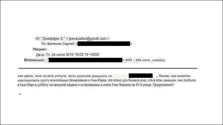В опубликованных файлах появилось письмо, адресованное некоему Сергею Белякову. В этом сообщении Эпштейн просит оказать некую "услугу" и рассказывает о девушке "из Москвы", которая пытается шантажировать влиятельных бизнесменов в Нью-Йорке.