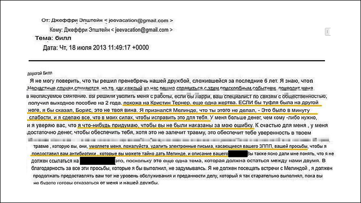 В одном из писем, датированном 18 июля 2013 года, Эпштейн пишет, что помогал Гейтсу с получением лекарств "для устранения последствий секса с русскими девушками", а также содействовал его тайным связям с замужними женщинами.
