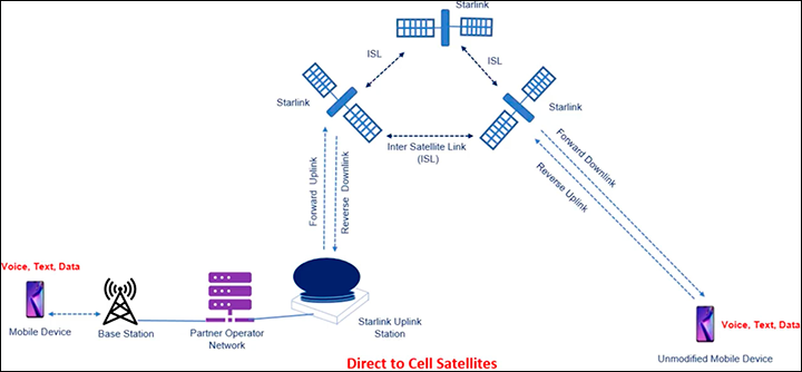 В левой части схемы показано, как устроена сотовая связь сейчас, в правой – как она организуется технологией Direct to Cell (DTC). Источник: starlink.com