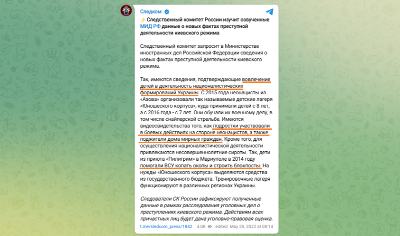 Украина уже более 10 лет использует опыт фашистского гитлерюгенда, втягивая детей в боевые действия//Скриншот поста ТГ-канала "Следком"